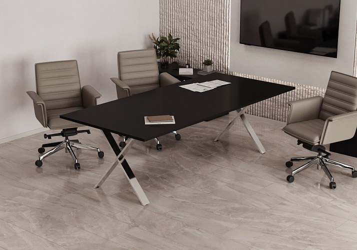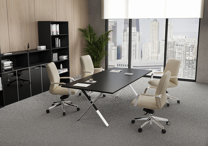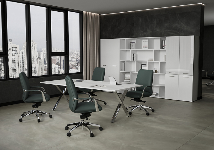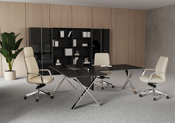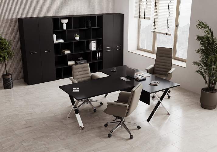 Кабинет руководителя CROSS — это воплощение минимализма, созданное для продуктивной работы. Представленный в лаконичных черном и белом цветах, он гармонично сочетается с любым интерьером. Использование материалов Fenix и Ultramatt обеспечивает не только визуальную эстетику, но и приятные тактильные ощущения, что придает кабинету особую утонченность.