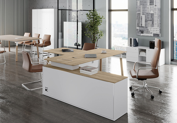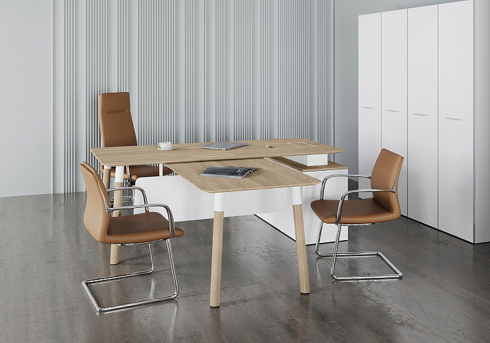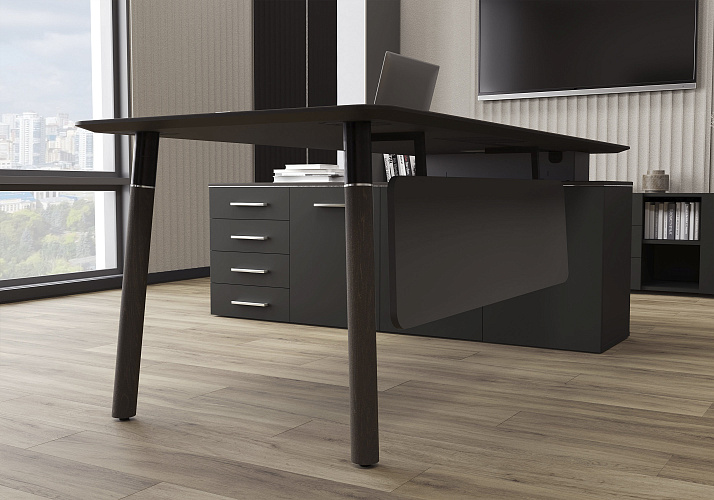 Кабинет Fresco — это истинный стиль для самых взыскательных руководителей! Столешницы и опоры, выполненные из массива дерева, дополненные декоративными проставками из нержавеющей стали, создают впечатляющий дизайн, в котором гармонично сочетаются классика и современность. Этот кабинет не просто функциональное пространство, а настоящая жемчужина, поражающая своим вниманием к деталям.